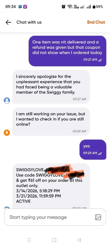Instead of refunding my money for the undelivered item, Swiggy issued me a coupon. Not even a proper one — it was: